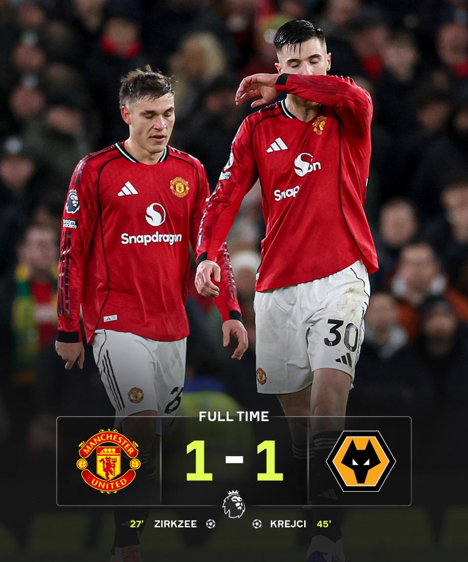 但上半场末端,狼队通过角球组织攻势,克雷伊奇在曼联后防疏漏下破门扳平,1-1!