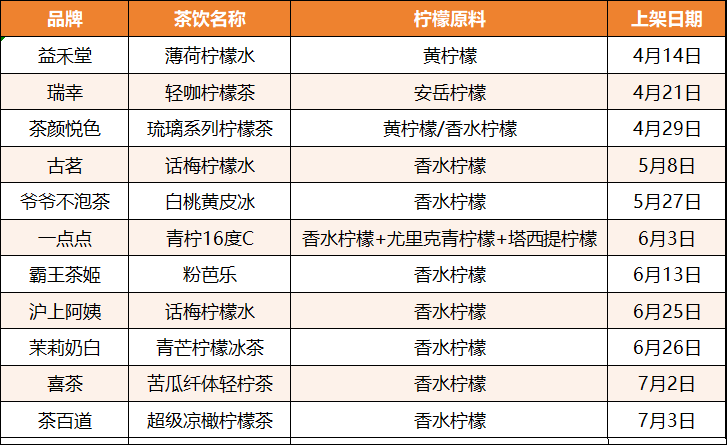 细化到饮料原料这一用途来看,伴随着温度的升高,茶饮市场的含“柠”量也越来越高。有意思报告统计发现,自4月中旬起,超十家主流茶饮品牌上新了(包含季节性回归)添加柠檬原料的饮品,这也意味着茶饮品牌定制化采购柠檬的需求量在不断增加。