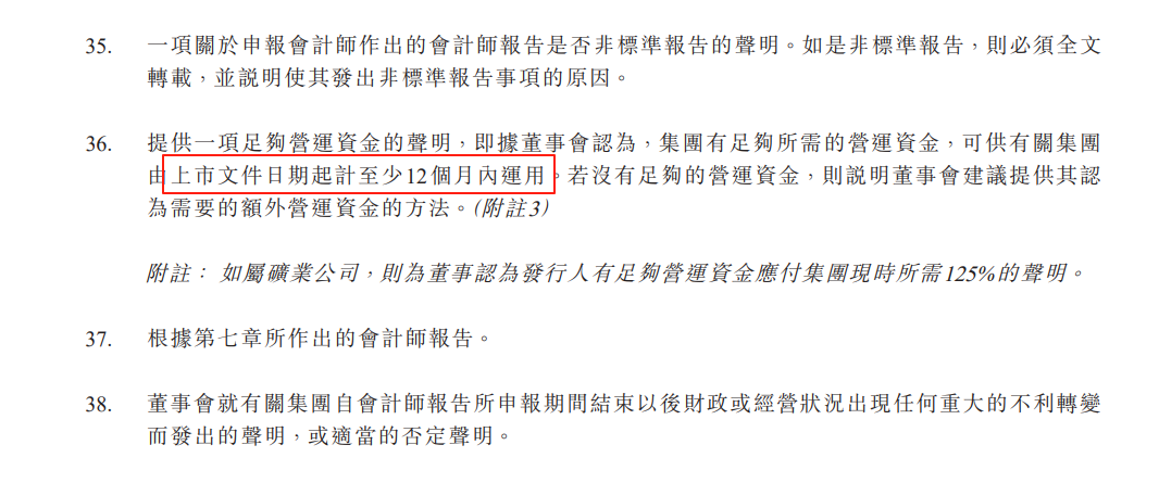 根据GEM上市规则,申请公司应有足够的营运资金以应付至少12个月的运营需求。