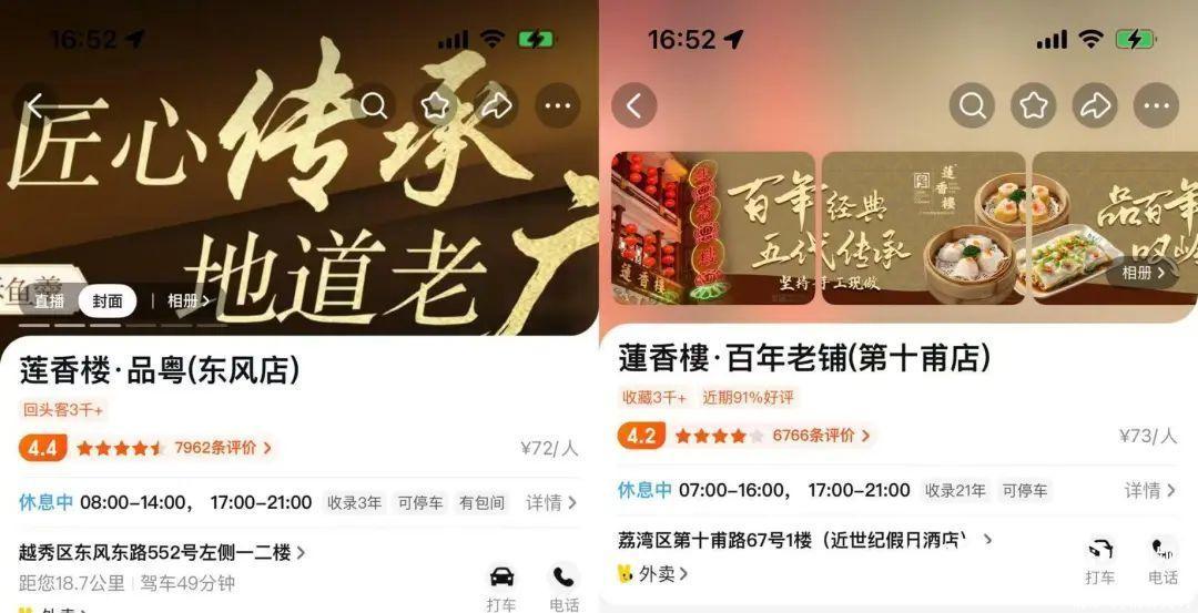 7月9日,南都湾财社记者查询美团平台发现,莲香楼(黄埔店)、莲香楼(东风店)页面显示其为“广府美食传承者”“匠心传承地道老广味道”等,而广州市莲香楼有限公司经营的莲香楼(沙湾店)、莲香楼(第十甫店)则显示“百年经典,五代传承”“中华老字号”等。
